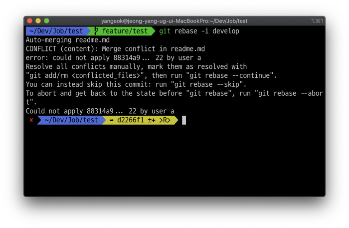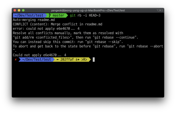충돌을 해결하고 stage에 올려서 커밋을 쳐줍니다. 커밋을 따로 정의하지 않고 git commit을 친다면 rebase할 때 선택한 커밋이 자동으로 입력됩니다.