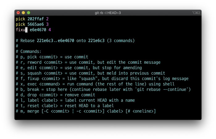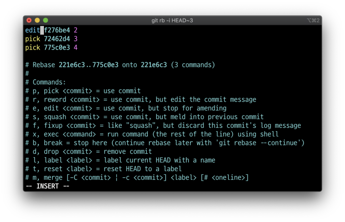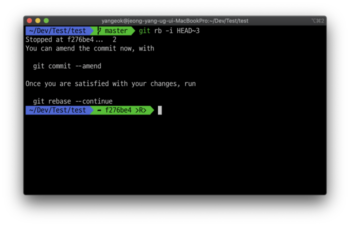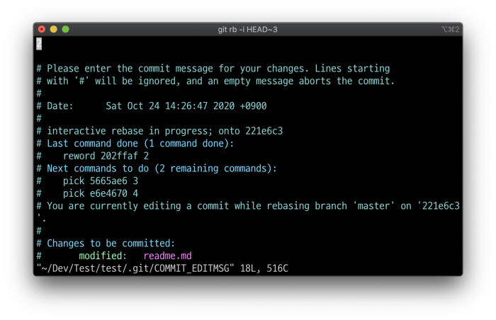 아래 나올 케이스들은 다른 테크닉도 사용 가능하겠지만, rebase를 위주로 다루는 글이니 유의하면서 읽어주세요. 두 가지 케이스를 설명하기 전에 대화형 rebase를 스크린샷과 함께 짧게 보고 가도록 하겠습니다.