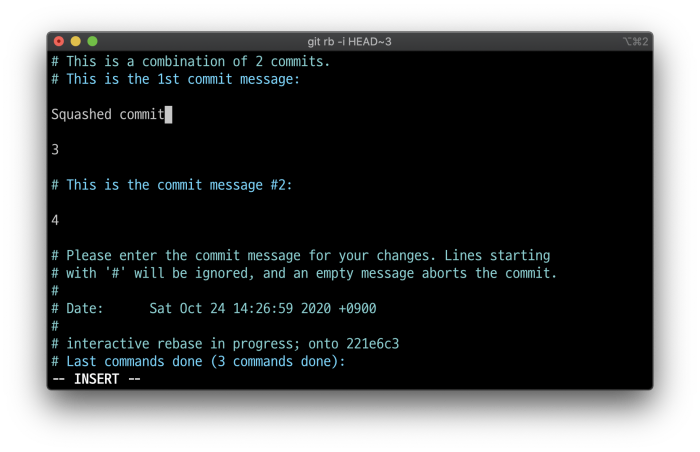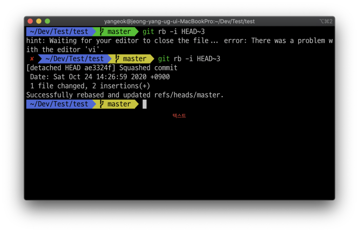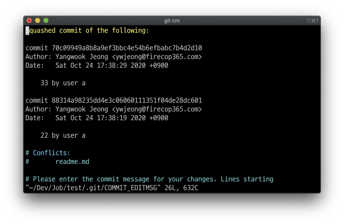 squash 옵션을 입력한 커밋과 바로 위의 커밋을 하나의 커밋으로 합칠 수 있습니다. squash 옵션을 여러 커밋에 써주면 여러개의 커밋을 하나로 합치는 것도 가능합니다.