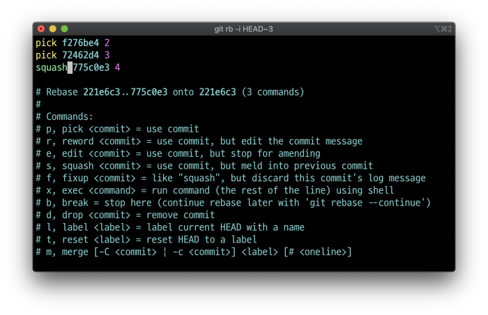 아래처럼 squash 옵션을 여러 개의 커밋에 적어주면 적어준 커밋 위의 커밋까지 합쳐서 squash를 합니다. 아래에서는 총 3개의 커밋을 squash 합니다.