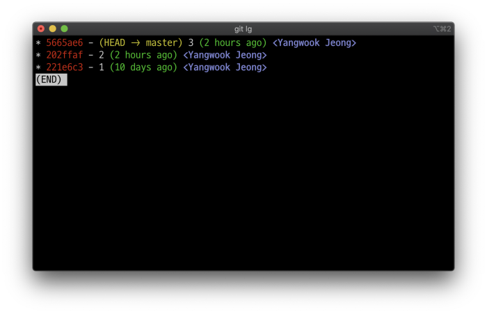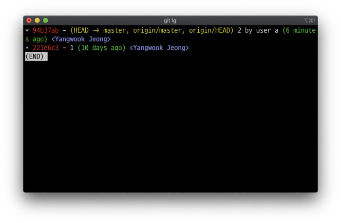 커밋까지 완성하고 나서 git rebase --continue를 치면 rebase를 빠져나오게 됩니다. 커밋로그를 보면 분기되었던 커밋로그가 한 줄로 합쳐진 것을 확인할 수 있습니다.