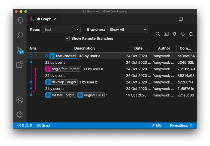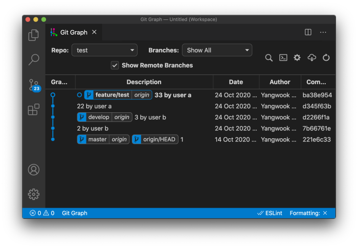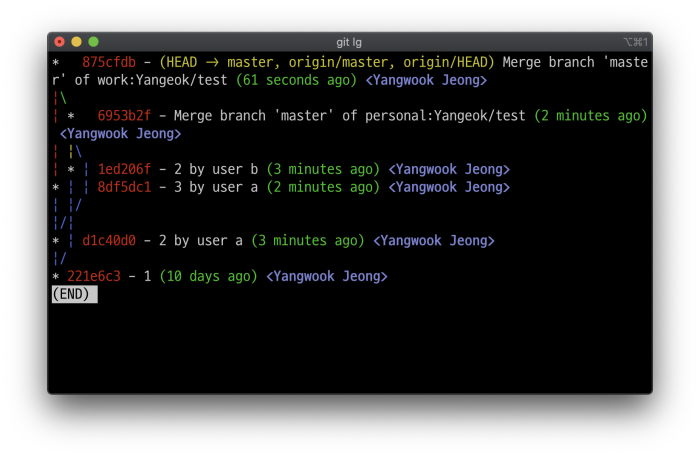 사용자 a가 먼저 커밋한 내용을 사용자 b가 동기화하지 않은채로 사용하다가 충돌때문에 Merge branch 커밋이 생긴 상황에 어떻게 한 줄로 커밋을 만드는지 보여드릴게요!