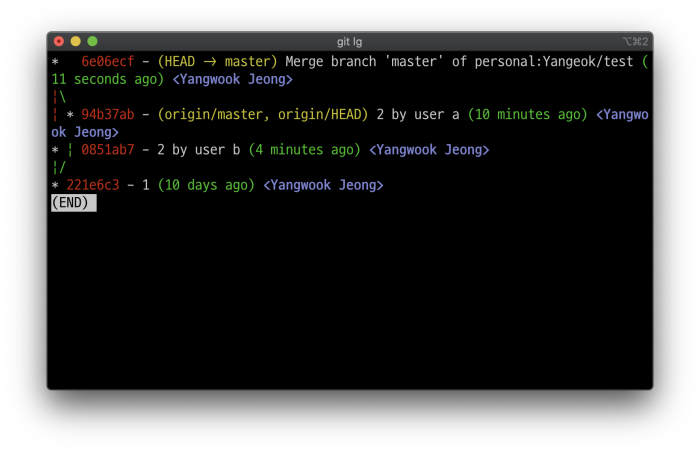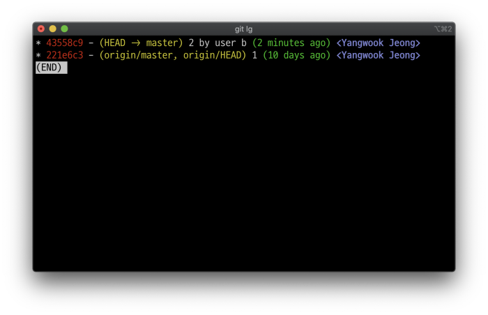 아래와 같이 사용자 a가 2 by user a라는 커밋을 먼저 origin에 push했습니다.