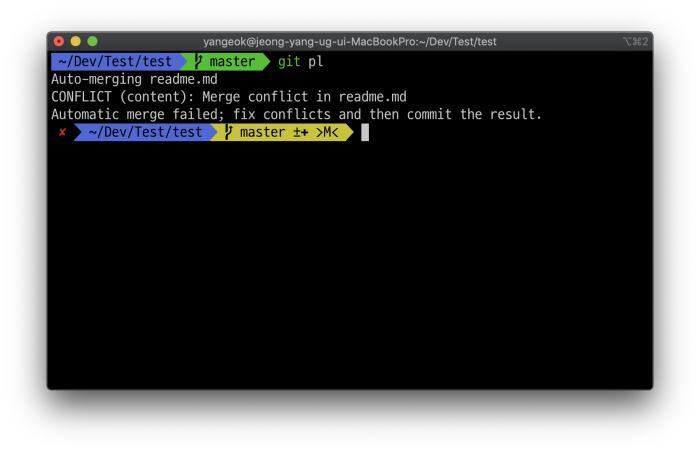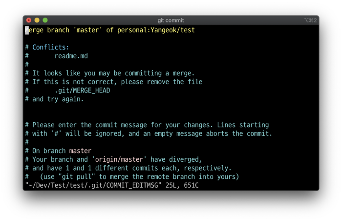 에디터를 탈출하면 auto-merging을 실행합니다. 아쉽게도 충돌이 발생했어요.