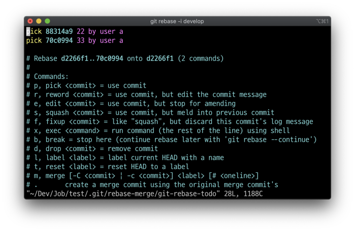 feature 브랜치에는 없는 develop 브랜치의 커밋인 2 by user b, 3 by user b을 feature 브랜치에 붙이려고 합니다. git rebase -i develop로 아래와 같이 대화 박스로 진입합니다.