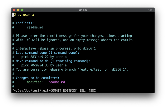한 줄로 커밋로그를 합쳐주기 위해 리베이스를 할겁니다. git rebase -i HEAD~1로 2 by user a 커밋을 1 커밋에서 분기한 가지에서 떼내서 2 by user b 위에다 붙여주려고 합니다. 옵션은 pick으로 그대로 내버려둡니다.