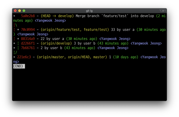커밋을 저장하고 에디터에서 빠져나오면 아래와 같이 develop 브랜치에 있던 커밋 위에 개발중인 feature 브랜치에 있는 커밋이 쌓이게 됩니다.